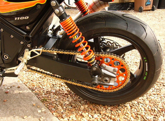 The front end was alway going to be Triumph 955i. These bikes in my opinion, look a little odd with USD forks, and the 955i legs are real chunky affairs that give the bike a more substantial look. These were sourced and the stanchions lengthened to meet the raised look I was after, then given a black nitrided finish. The lower Triumph clamp was fitted with the Zeph stem and they are then held together at the top by a LSL 955i top yolk. The rear was a little more difficult, replacing that stock swingarm with a more substantial item, required mucho machining by Billy Kaiser but he worked his usual miracles. This CB1300 swingarm is suspended by 2 custom made Hyperpro shocks, made to my requirements and considerably longer than stock, this gives me my increased ride height but the same geometry as standard (ish) with only a 10mm drop at the front for the sharper steering. Wheels are from an Aprilia as the spindle sizes match the front and rear Triumph/Honda. Stopping is